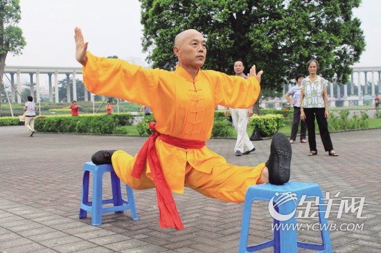 “農(nóng)民工組合”中的武者張中心來自河南孟州,體魄結(jié)實,剃著光頭,頗有點少林寺武僧的范兒。張中心告訴記者,自己出生在有著“武術(shù)之鄉(xiāng)”之稱的孟州化工鎮(zhèn),從小就對武術(shù)癡迷。與王文正一樣,張中心同樣從小家境貧寒,早年父親得了精神病,家里沒了頂梁柱,張中心也是小學(xué)沒畢業(yè)便輟學(xué)了,兄妹三人都是母親一人拉扯大。由于父親精神病發(fā)作,出去惹了不少事,遭到了鄰居的不解和謾罵,兄妹幾個也常被欺負(fù),于是張中心暗下決心,學(xué)好武術(shù),保護(hù)家人不被欺負(fù)。說到這,張中心覺得自己走上習(xí)武之路的初衷有些偏頗,“習(xí)武之人不可為一己之私,以怨報怨,有違武術(shù)之道,所以現(xiàn)在打算免費傳授一些武術(shù)給大家,當(dāng)做健身之道。”
