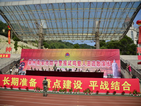 “我宣布,泉州南安市防空警報試鳴暨人員疏散演練開始!”隨著演練指揮長南安市人民政府常務(wù)副市長劉敏堅發(fā)布命令,警報急促鳴響,操場上的各單位演練人員和600多名的實驗中學(xué)師生迅速向指定防空地下室疏散掩蔽;隨后,現(xiàn)場各專業(yè)隊按照計劃和程序開展救援、救護(hù)、消除空襲后果的各種演練和演示活動。本次演練除了南安實驗中學(xué)這個主會場,還有分會場市區(qū)3個街道辦事處及15個重點鎮(zhèn)參與演練。